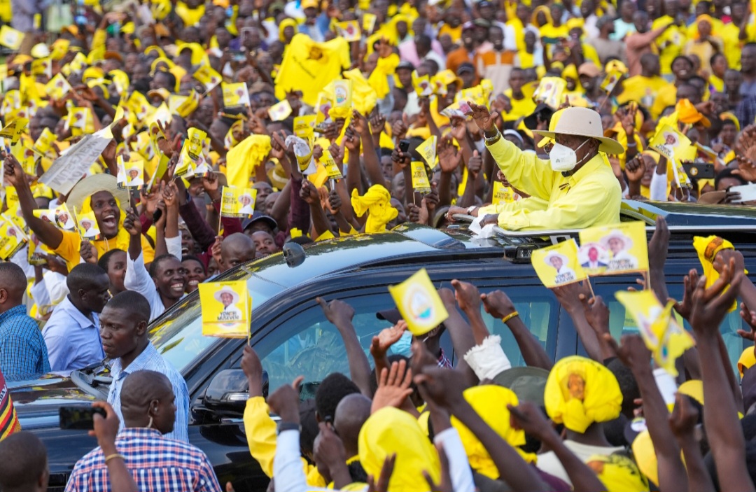 MBARARA; President Yoweri Kaguta Museveni, accompanied by First Lady and Minister of Education and Sports, Maama Janet Museveni, was this afternoon received by thousands of supporters at Booma Grounds in Mbarara City as he continued his campaign trail in Ankole Sub-region.